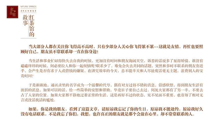 這就是《紅茶館》的由來(lái),讓我們一起繼續(xù)編寫(xiě)《紅茶館》的故事。自然而然想起你的自然泉團(tuán)隊(duì)是一群有理想的年輕人。我們希望通過(guò)我們的所作所為,能喚起人與人之間的感情,能溫暖那些不曾常聯(lián)系的人。