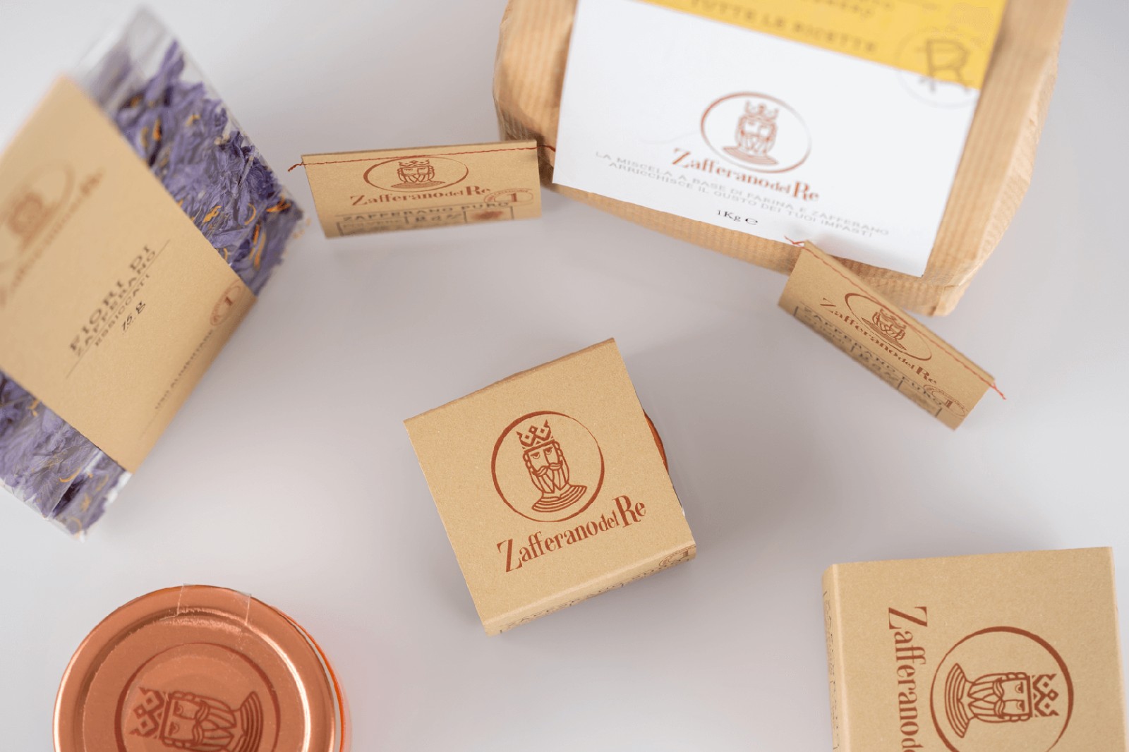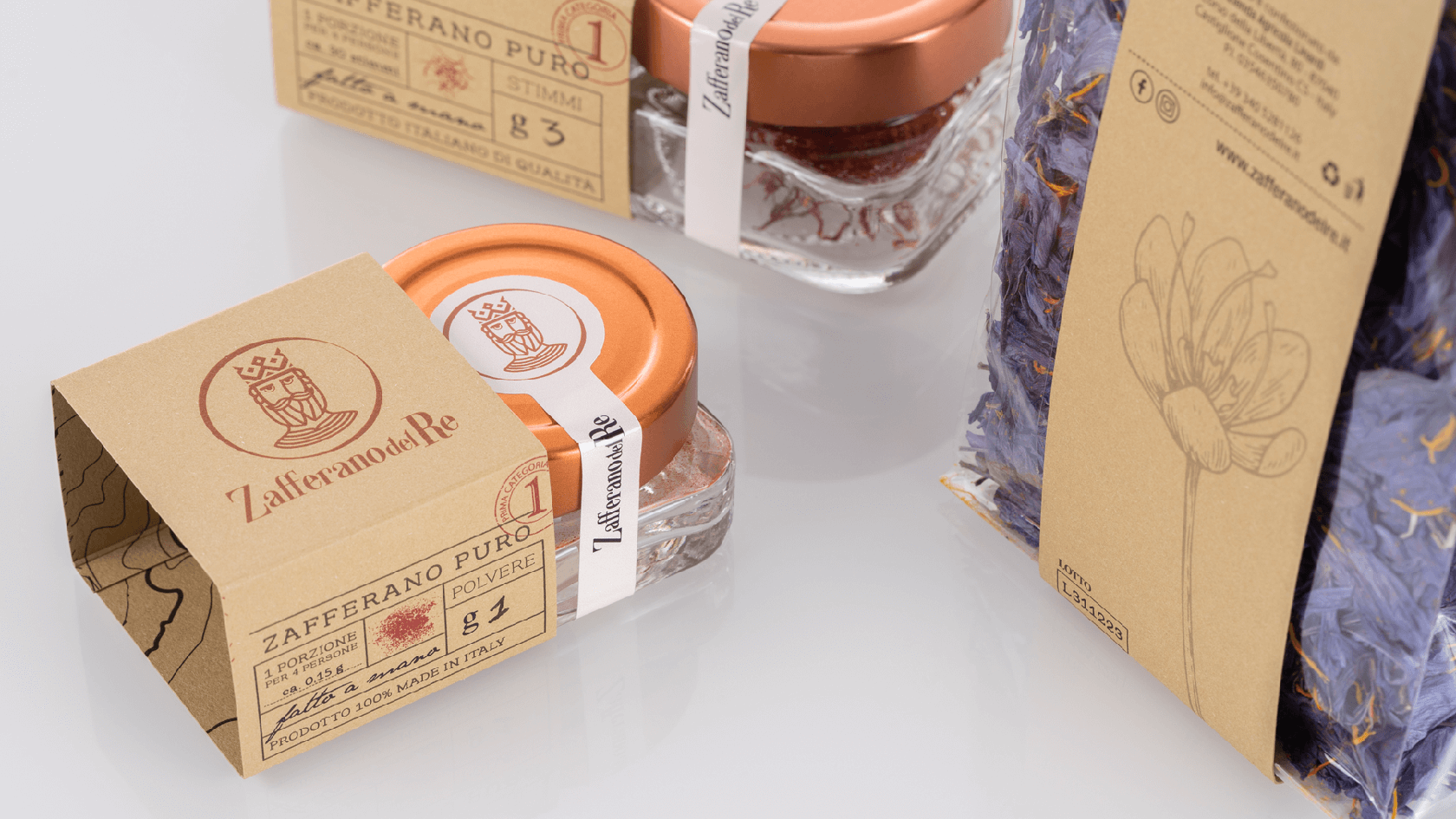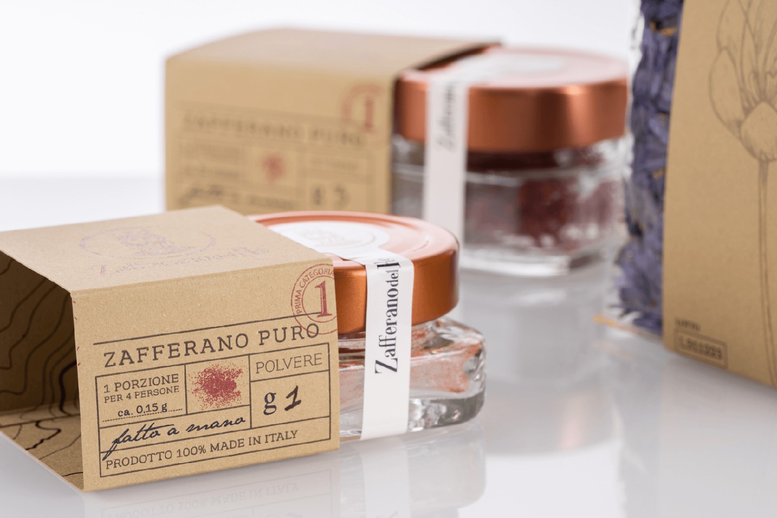 像國王寶藏中的黃金那樣的貴重產(chǎn)品,以純藏紅花的形式分布在柱頭和粉末中,像食用花卉一樣干燥,加到蜂蜜中成為原始的Smielace,與面粉混合后變成L'oro del Busento。每個包裝都是用手封閉的,即使是單劑量包裝的密封圈也帶有紅色螺紋接縫。每包中都包含一張藏寶圖,以強(qiáng)調(diào)藏紅花的概念:藏寶。